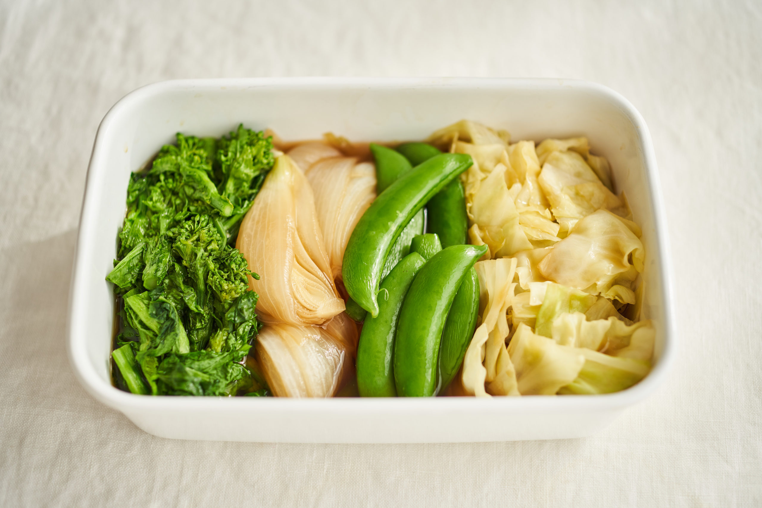 新玉ねぎ、春キャベツ、菜の花、スナップエンドウを使って、春をたっぷり味わえます。