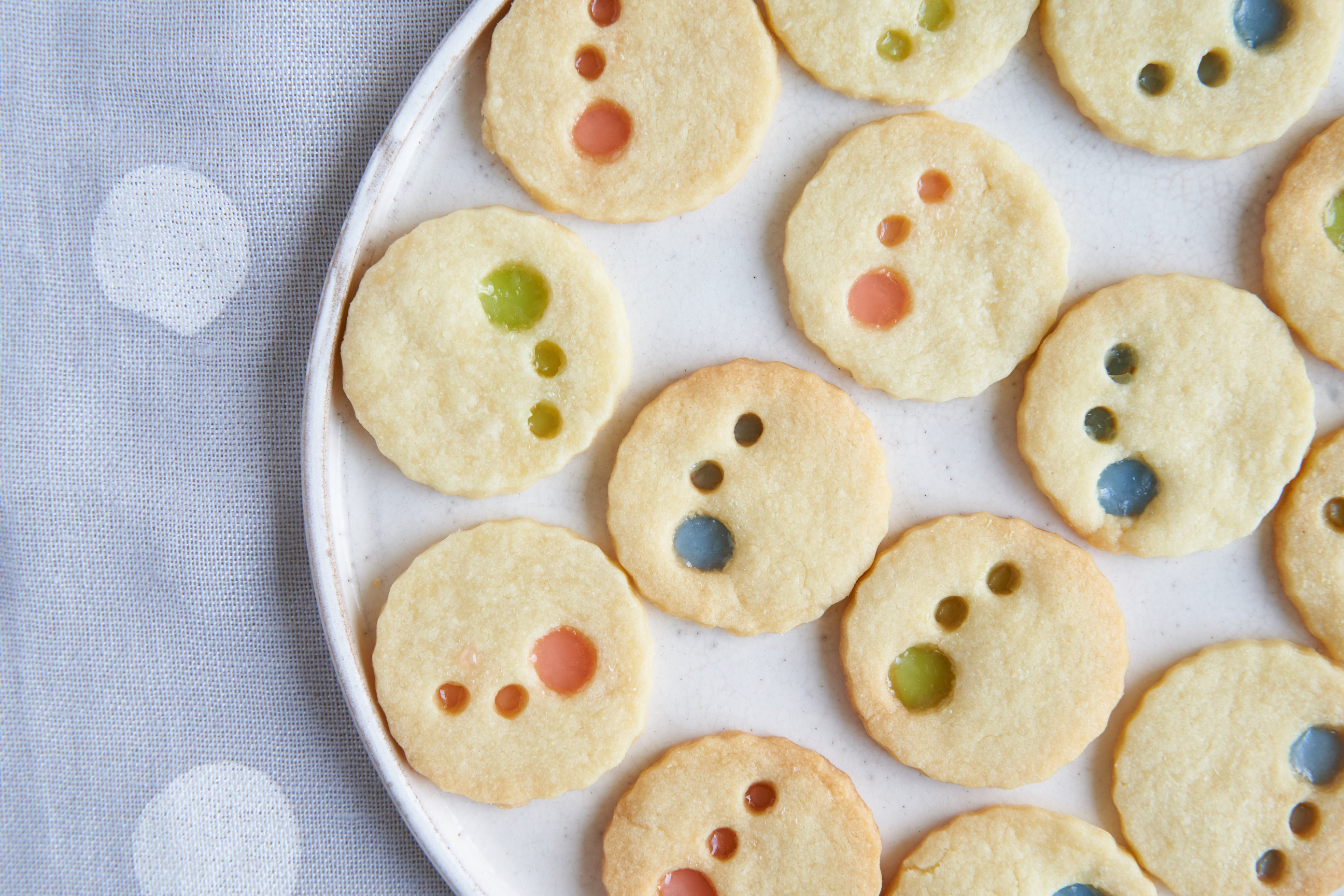 飴玉のドットがカラフルに輝くステンドグラスのようなクッキーです。