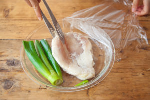 耐熱皿に鶏肉を入れて、あれば長ねぎの青い部分をのせて、酒をふり、