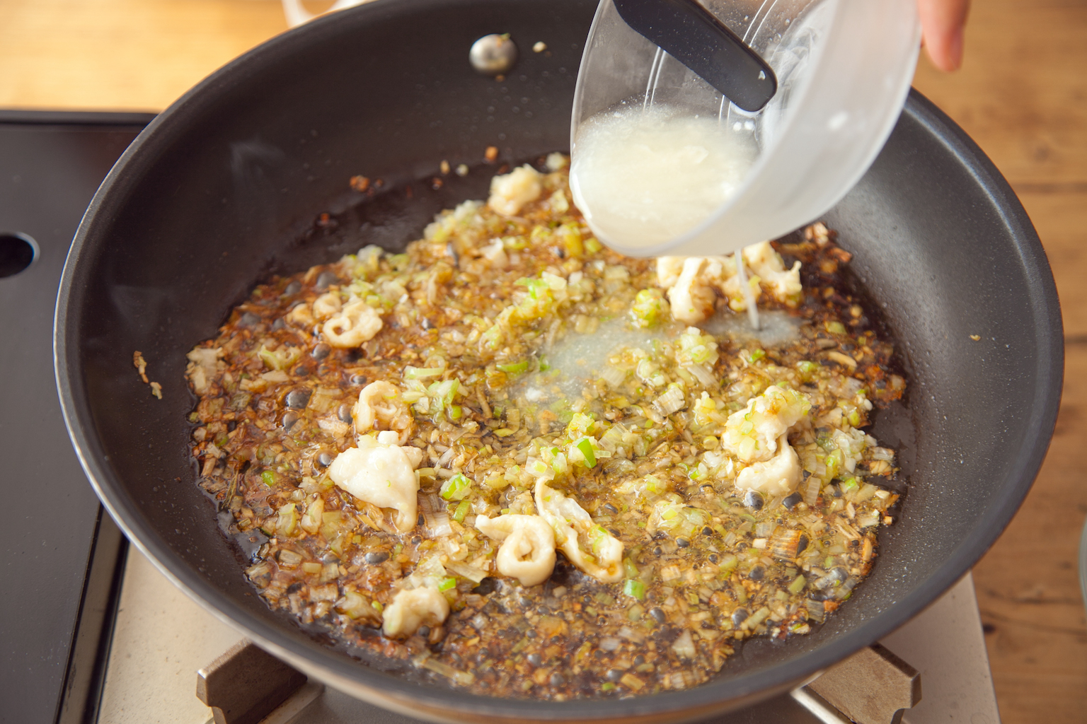 じっくりと炒めて焼き色がついたら、(A)、2の蒸し汁を加え、一煮立ちさせる。