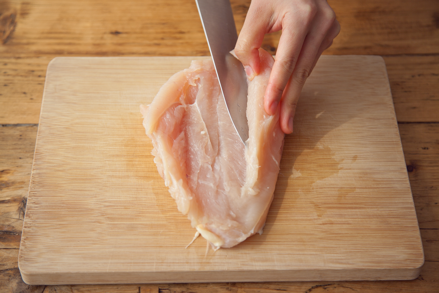 鶏むね肉は皮をはがし包丁を入れて厚みを均一にし、保存袋にいれる。