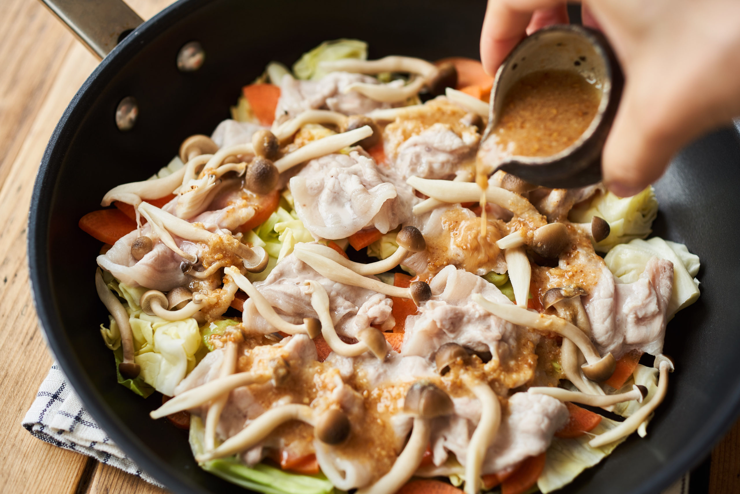 フライパンにキャベツ、にんじんを広げ、豚肉を1枚ずつふわりとのせ、しめじをのせる。