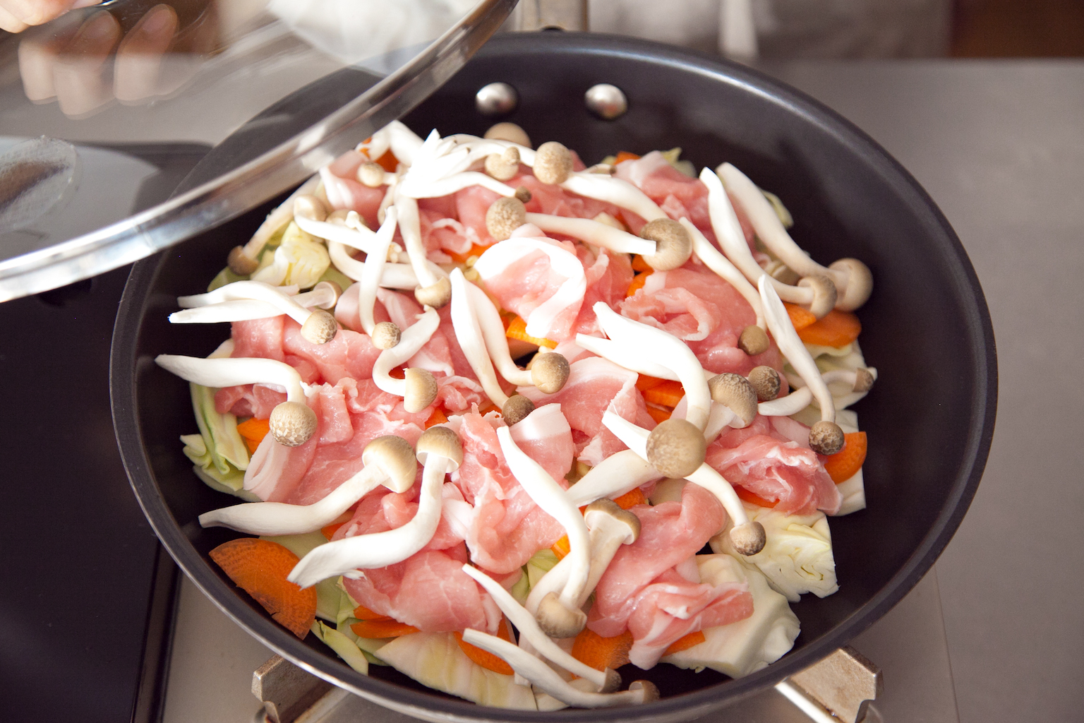 フライパンにキャベツ、にんじんを広げ、豚肉を1枚ずつふわりとのせ、しめじをのせる。