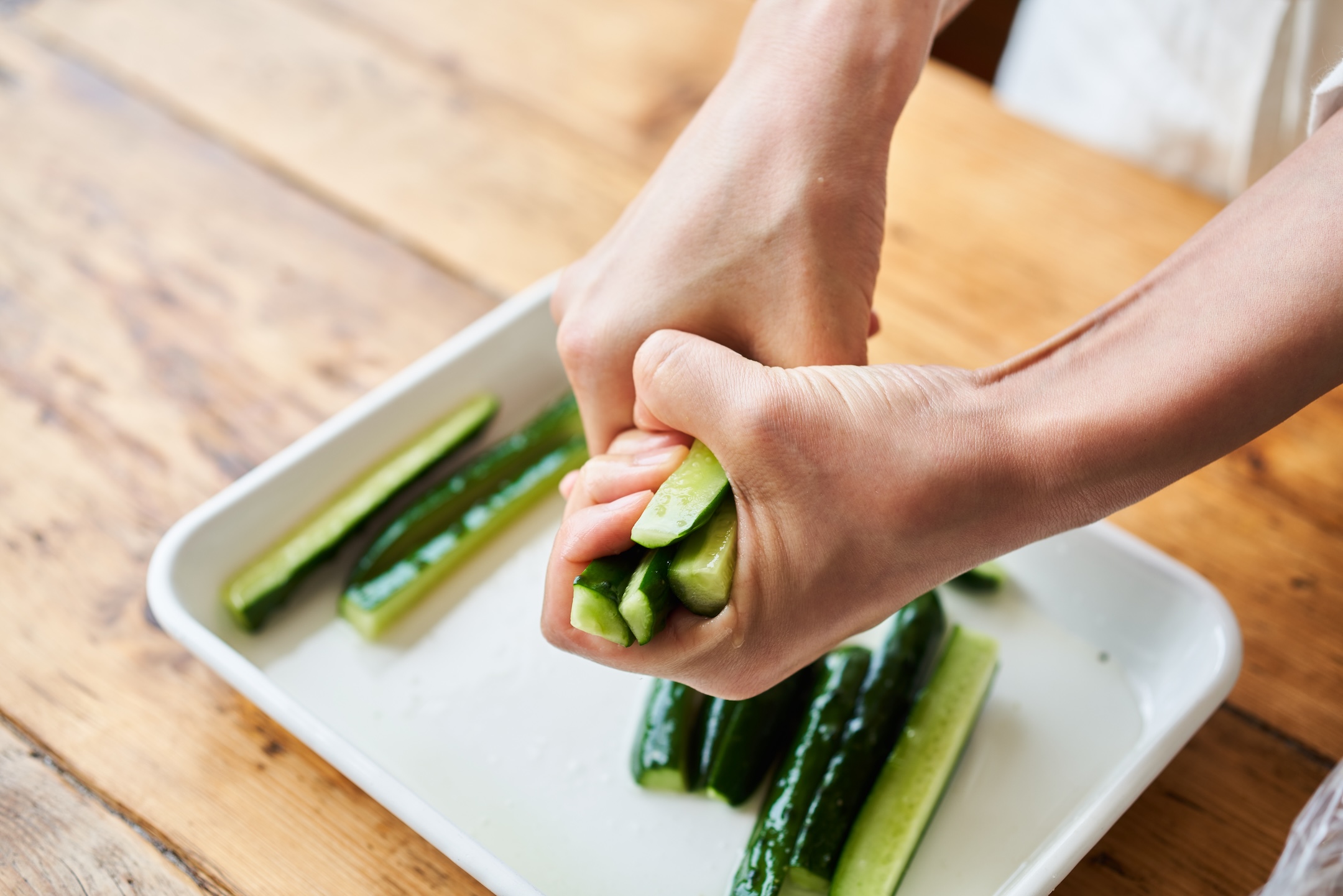 きゅうりは長さを半分、四つ割りにしてバットなどにいれる。