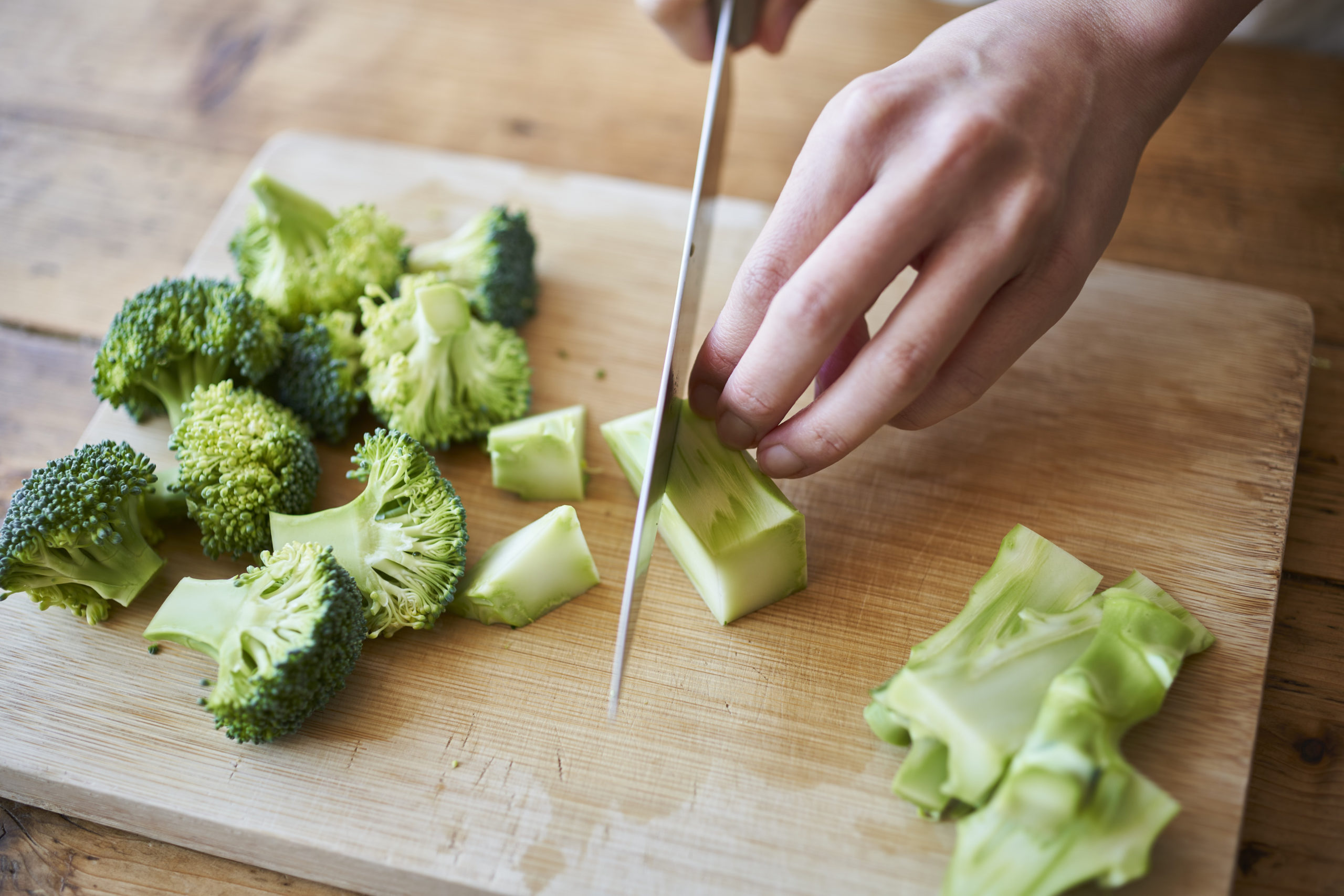 ブロッコリーは小房に分け、茎は皮を剥いて乱切りにする。