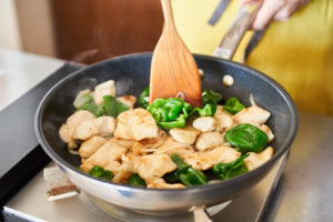 しんなりしたら、鶏肉、ピーマンを入れて3〜4分炒める。
