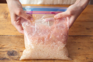 炊飯器の内釜にふきんを敷いて、1をのせ、袋の口を少し開ける。