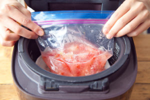 炊飯器の内釜にふきんを敷いて、1をのせ、袋の口を少し開ける。