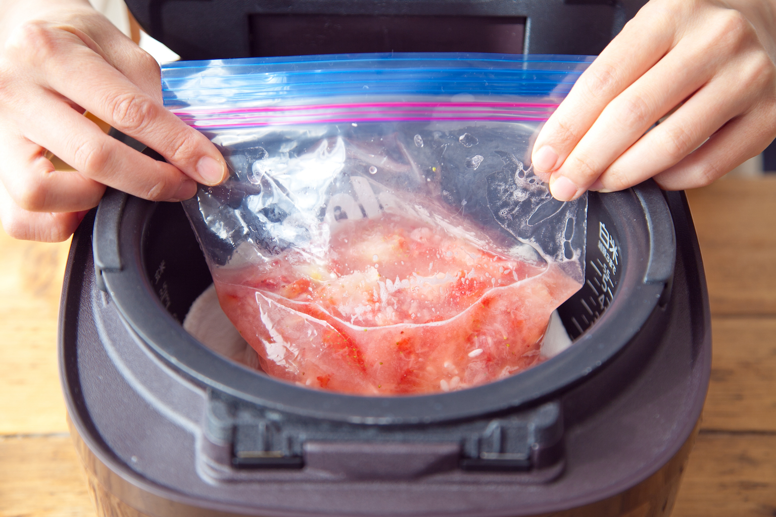 いちごはヘタを取り、保存袋に入れ、手でつぶす。