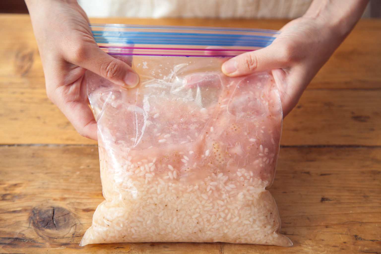 湯、米麹を加えて揉み、全体をなじませる。