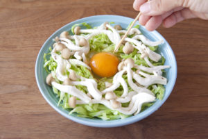 耐熱皿にへるしごはん、キャベツ、しめじをのせ、中心部をくぼませて卵を割り入れる。卵黄に竹串で数カ所穴をかける。