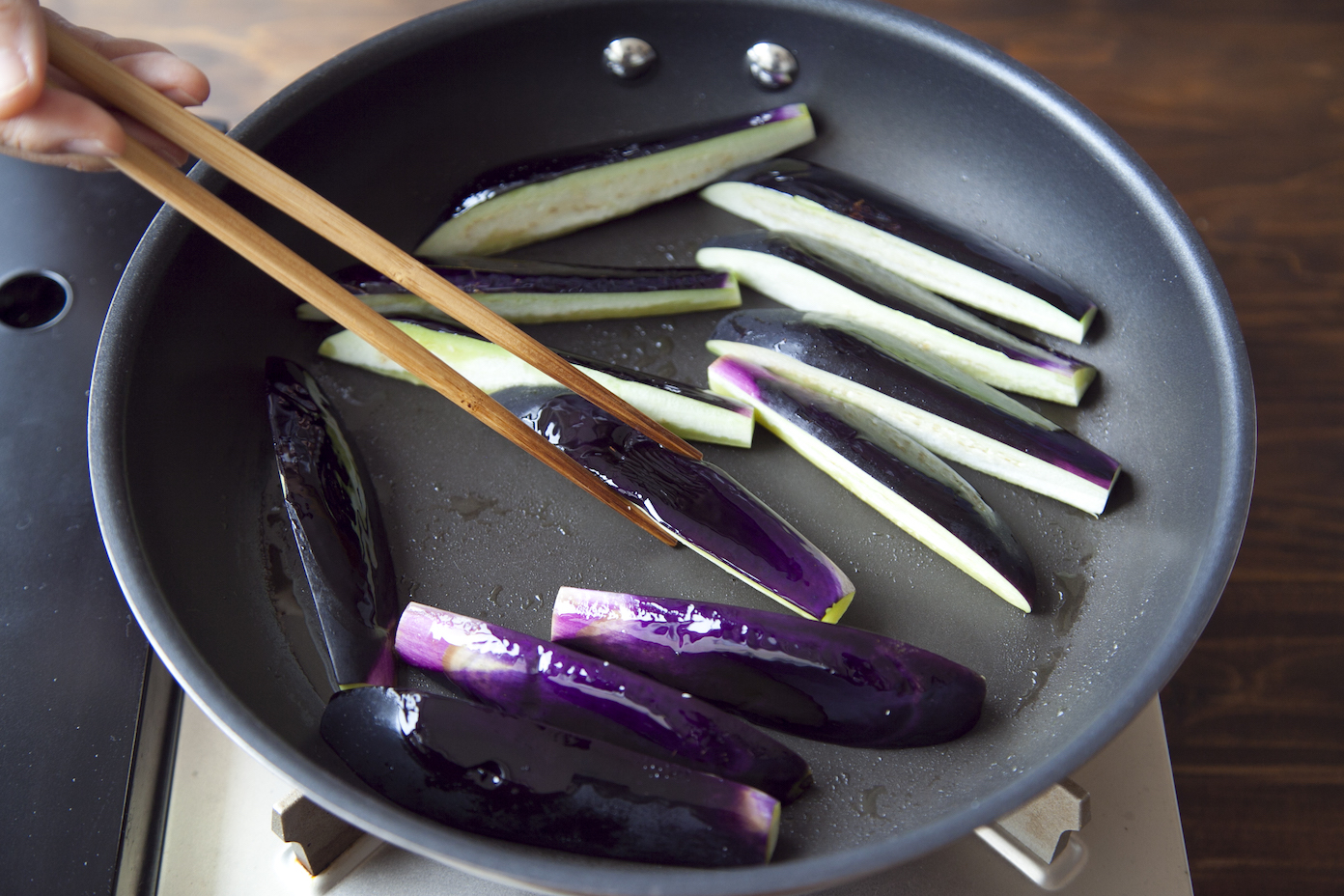 フライパンにオリーブオイル大さじ3を熱し、強火でなすを焼く。