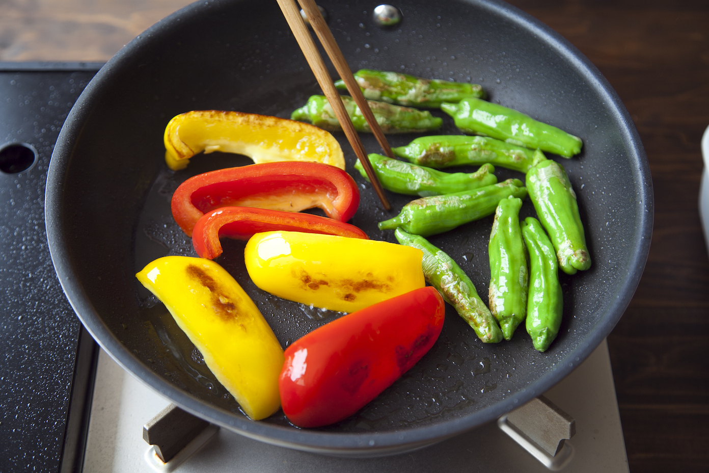 パプリカはそれぞれ縦3〜4等分に、ししとうはへたの先を切り破裂しないよう切り込みを入れる。