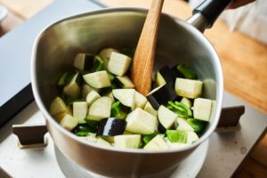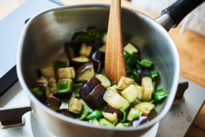 ピーマンは1.5cm角、ミニトマトは縦半分、なすは1.5cm幅のいちょう切りにする。