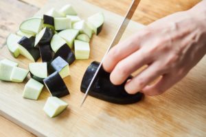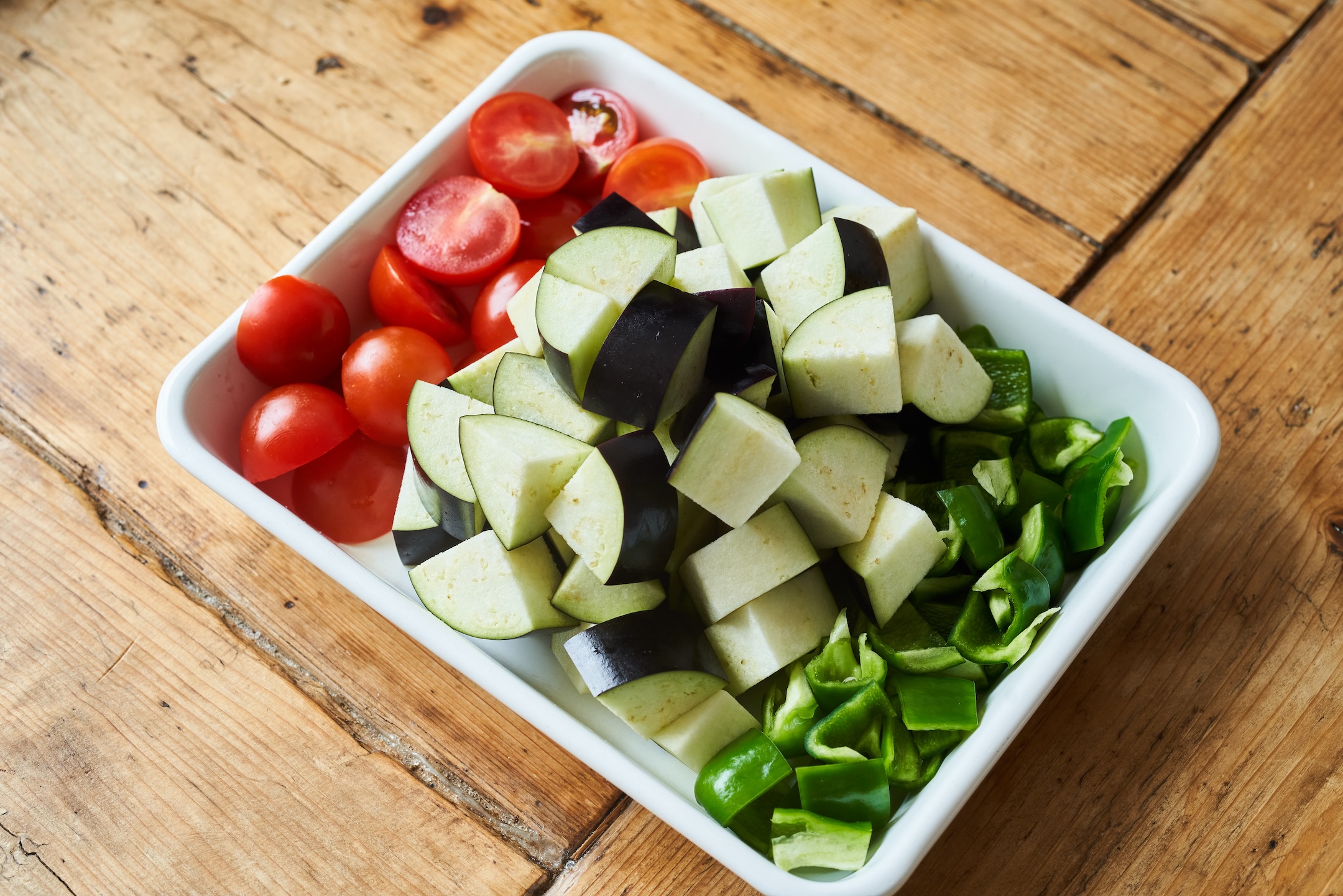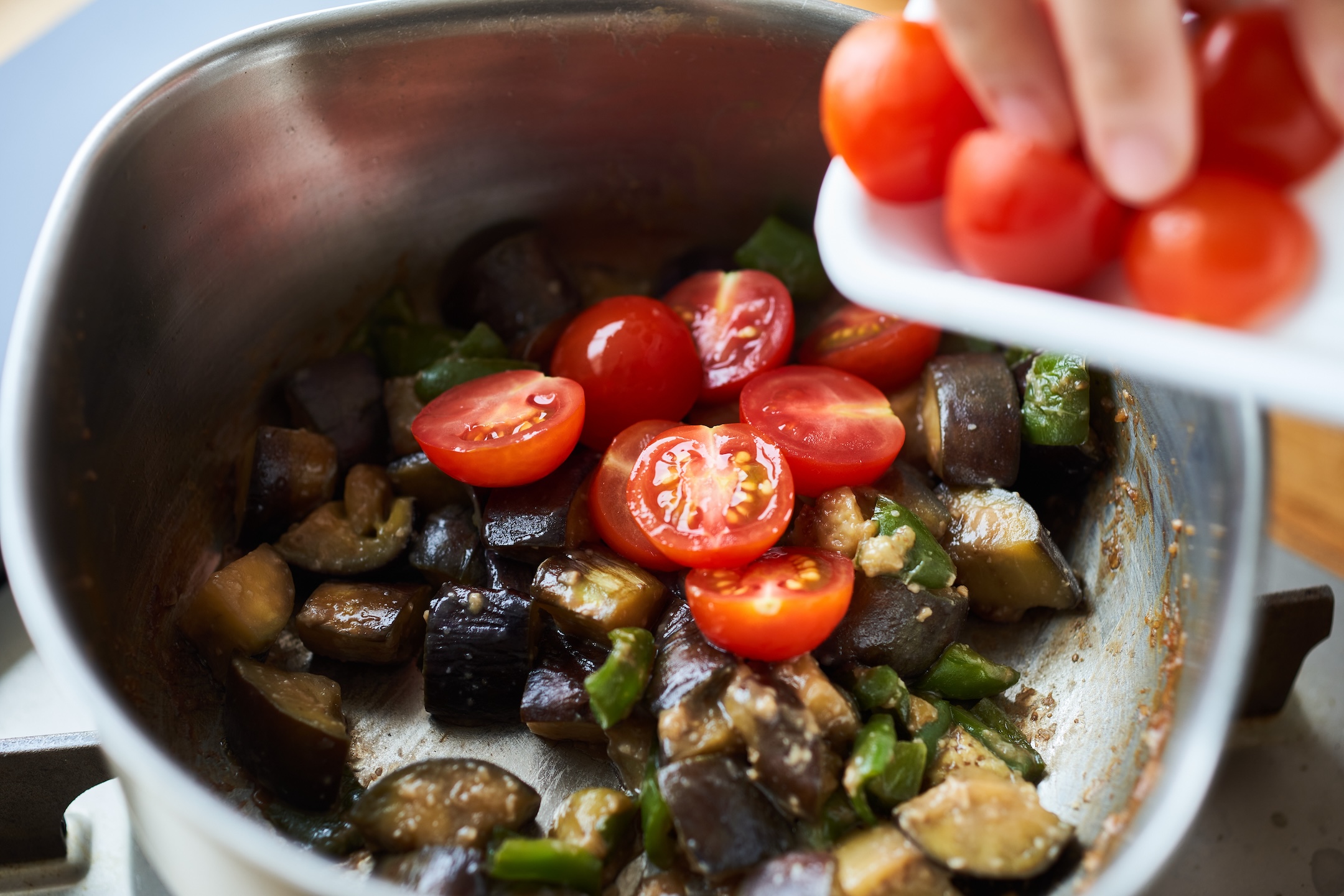 ピーマンは1.5cm角、ミニトマトは縦半分、なすは1.5cm幅のいちょう切りにする。