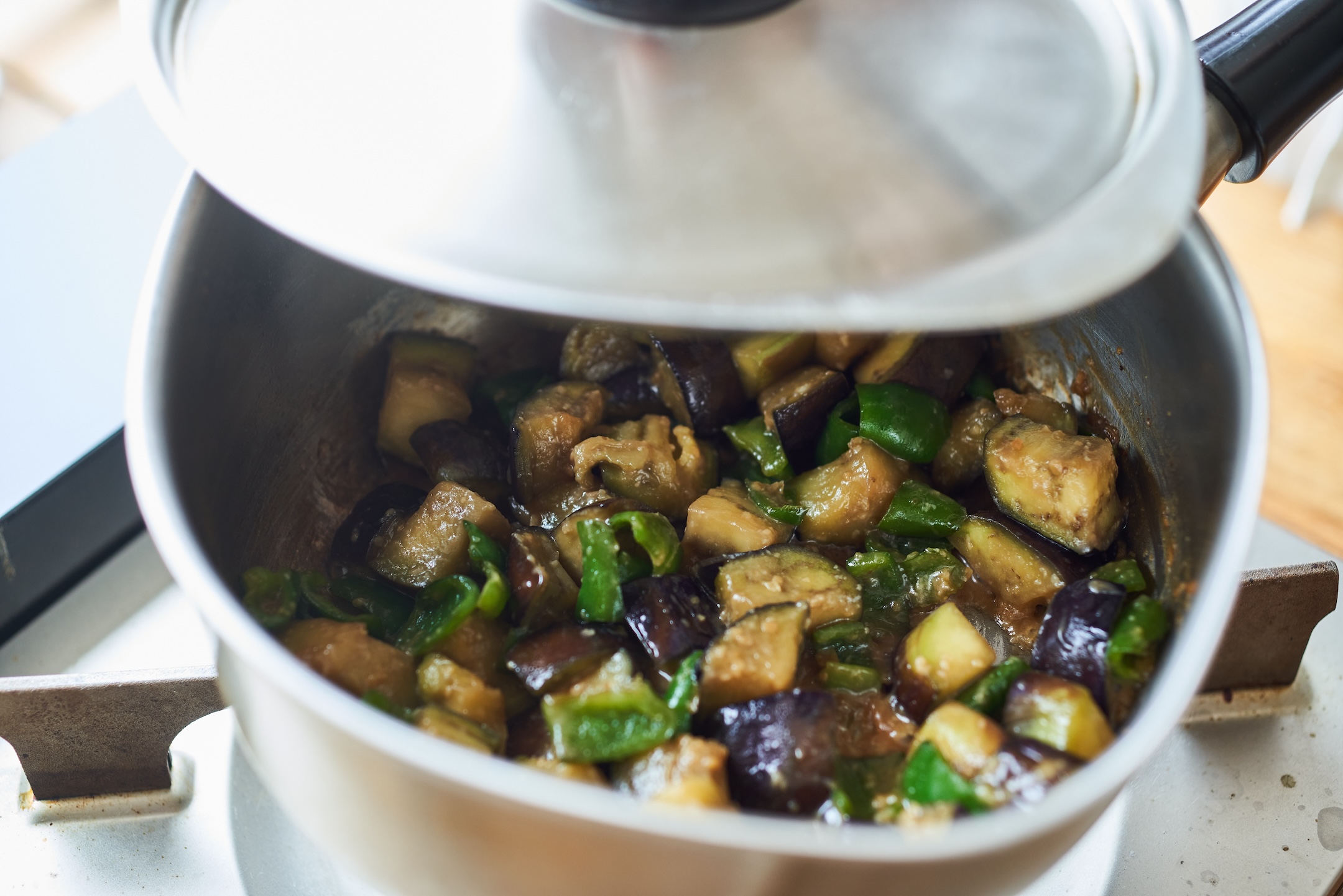 鍋にごま油を中火で熱し、なす、ピーマンを入れて2〜3分炒める。