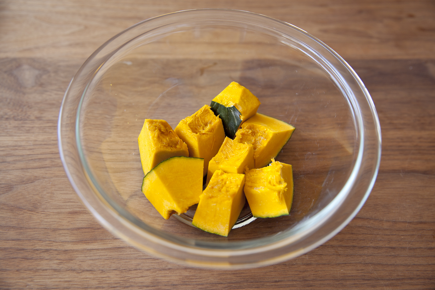 かぼちゃは一口大程度に切って耐熱ボウルに入れ、ふわりとラップをかけて電子レンジ600Wで5分程度、竹串がすっと入るまで加熱する。