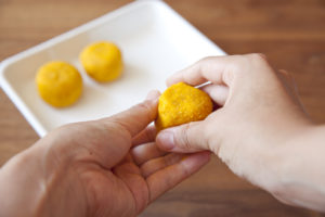 3を6等分にして円柱になるように成形し、ミックスナッツを粗めに刻んで周りにつけ、上面に残りの卵黄を溶きほぐして塗り、トースターで10分程度焼く。