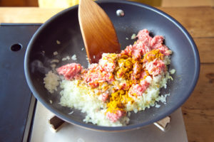 玉ねぎがしんなりしたら、合い挽き肉、カレー粉を加え炒め、