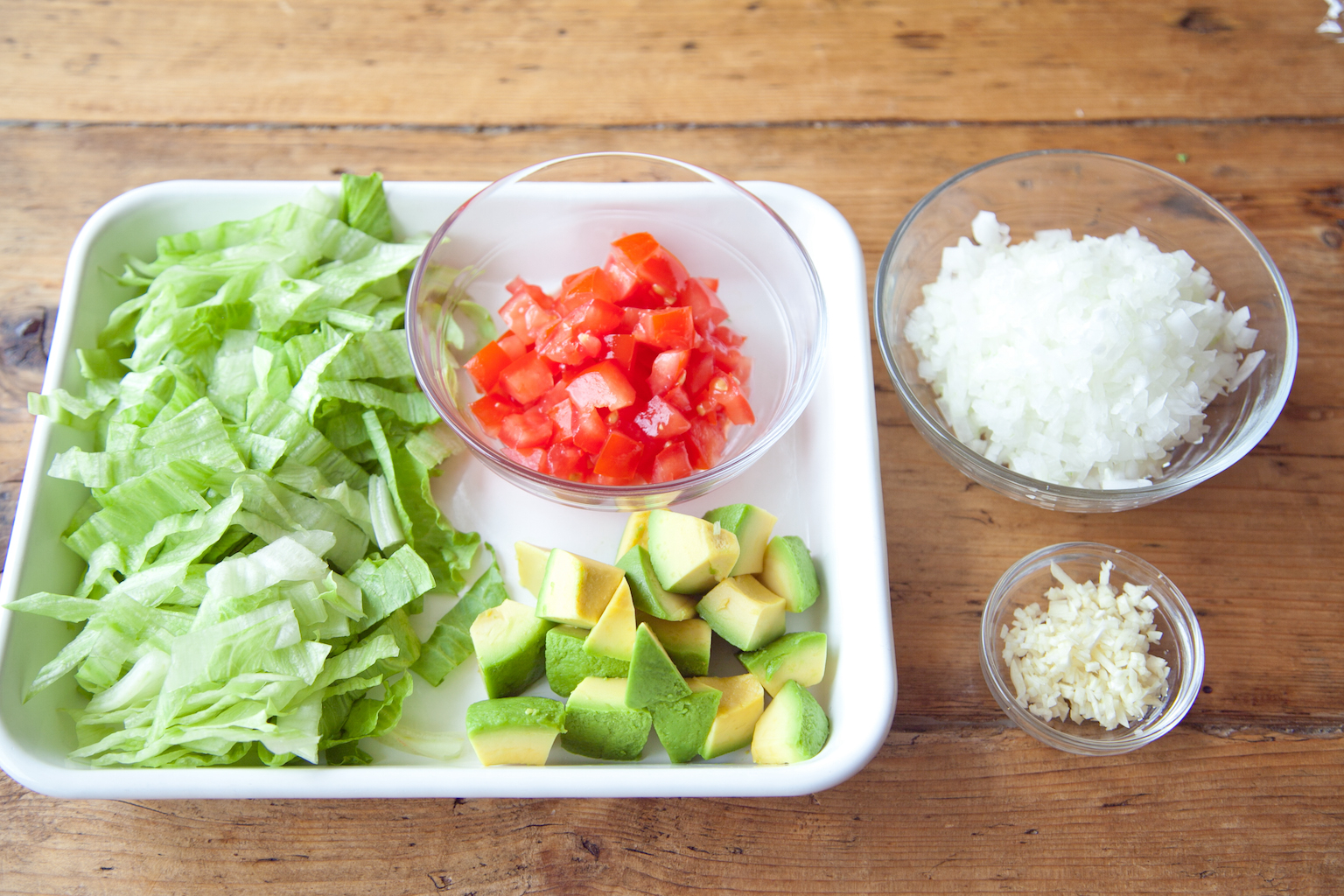 レタスは食べやすい長さの1cm幅、アボカドは一口大、トマトは1cm角、