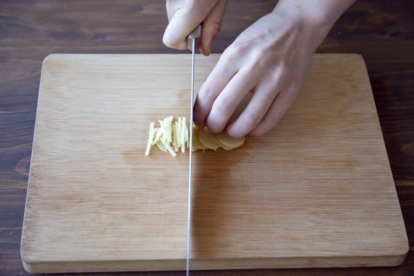しょうがは半量を薄切りに、半量を千切りにする。 長ねぎは小口切りにする。