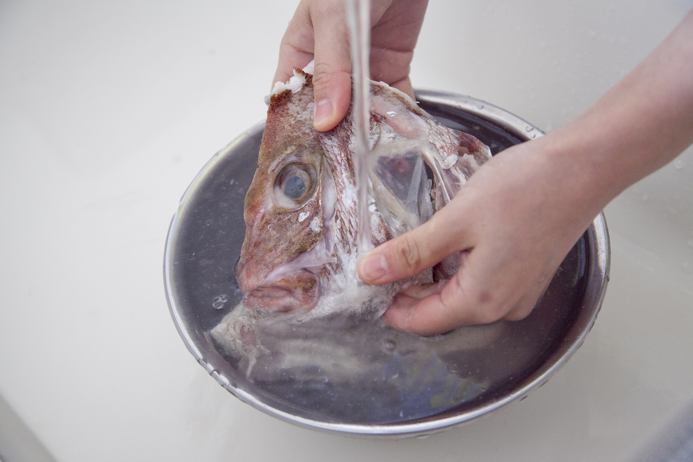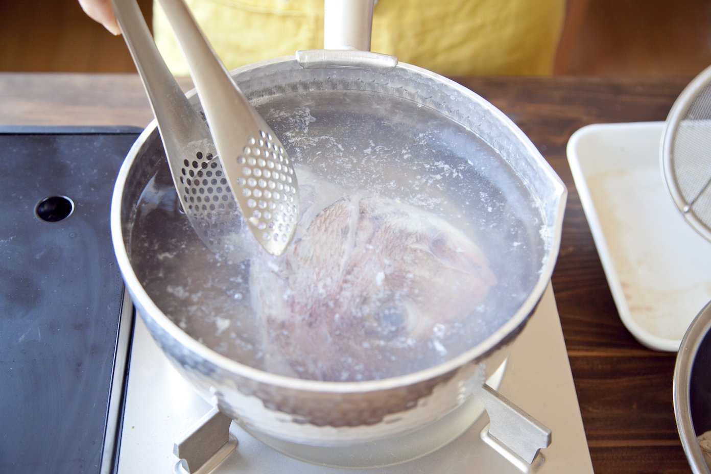 鍋に湯を沸かし、鯛をさっといれて霜降りする。