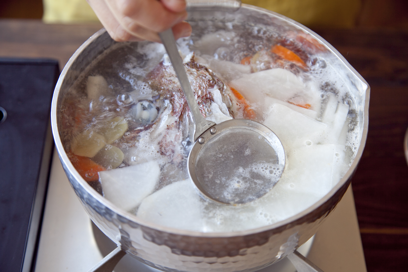 このポイントで、あらの臭みが取れて旨味たっぷりのおいしいあら汁に仕上がります。