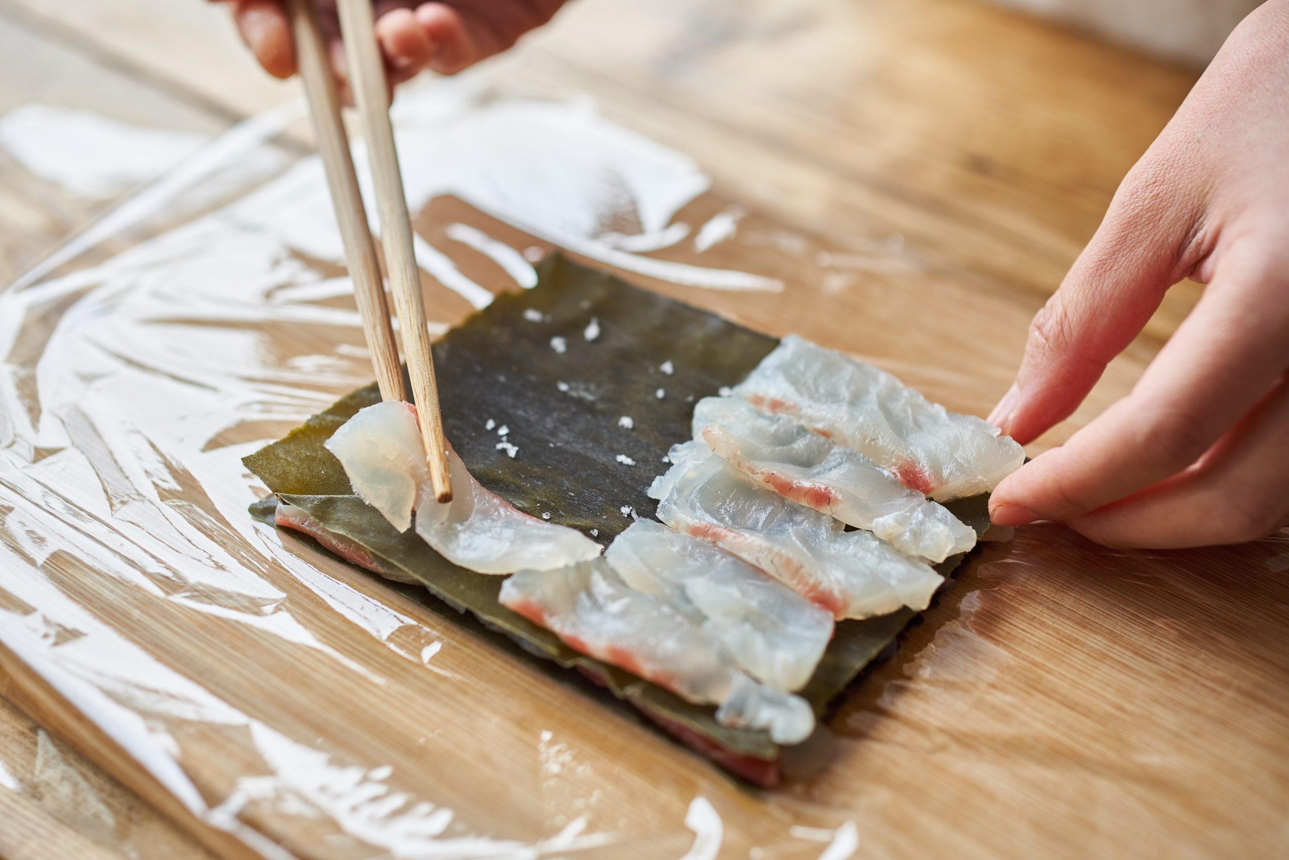 ラップの上に昆布をのせ、粗塩少々をふって鯛を並べる。