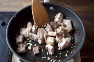 フライパンにサラダ油を中火で熱し、豚肉を入れる。