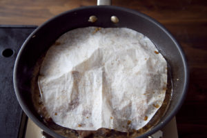 全体になじんだら、(A)と水150mlを入れてクッキングシートの落し蓋をし、