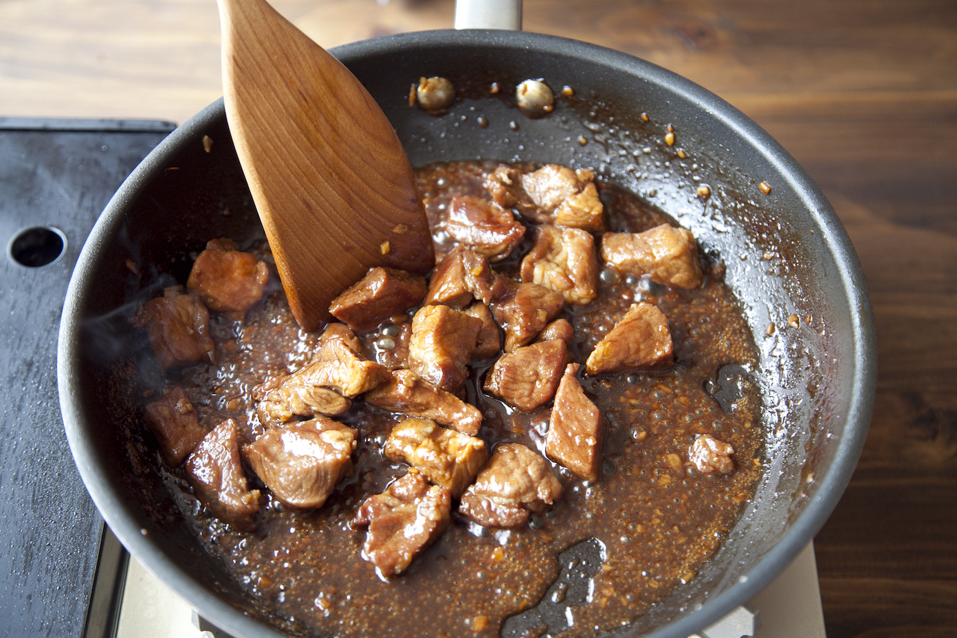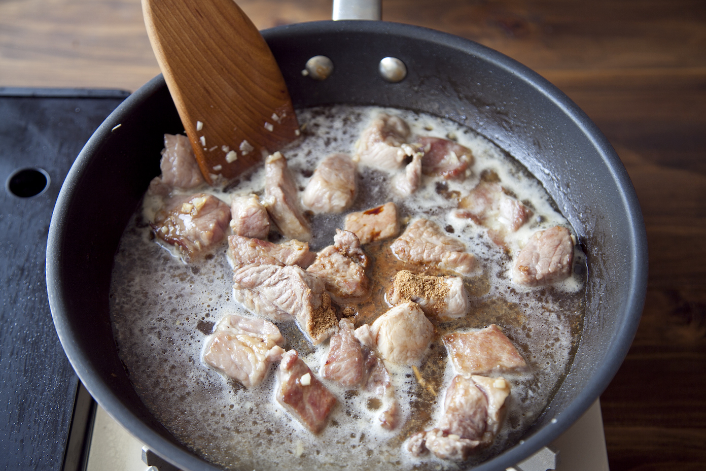 【3】肉の全面に焼き色がついたら、きび砂糖を加え混ぜる。
