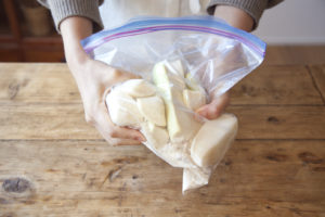 ジッパー付き保存袋に、1、粗塩、きび砂糖をいれてよく揉み込んでから、