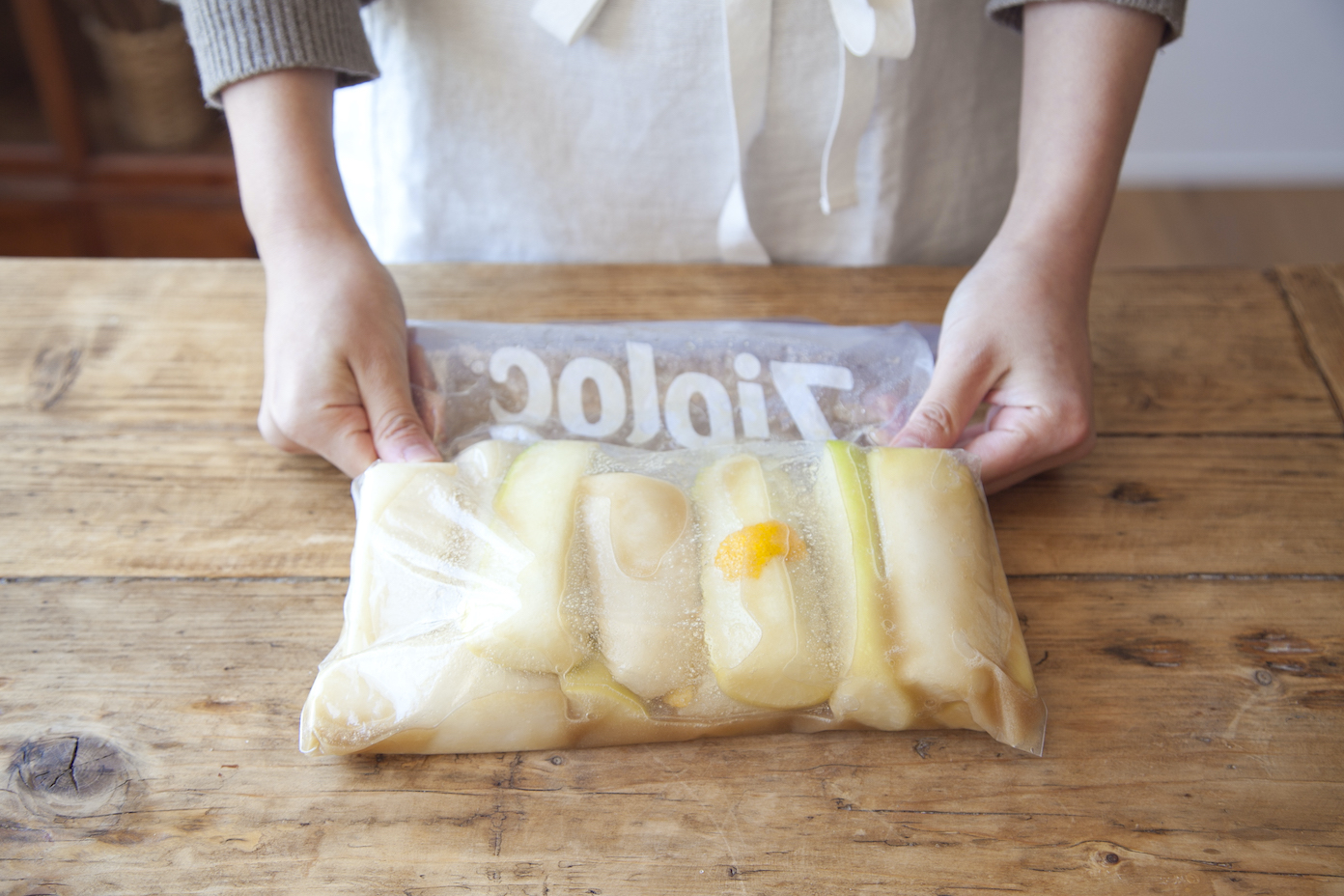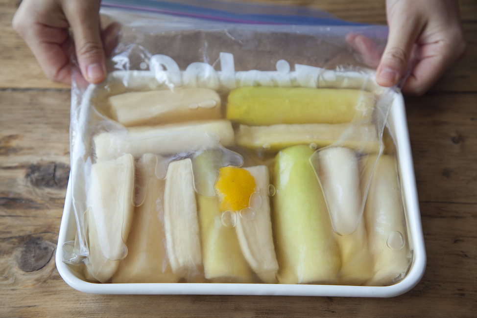 ジッパー付き保存袋に、1、粗塩、きび砂糖をいれてよく揉み込んでから、