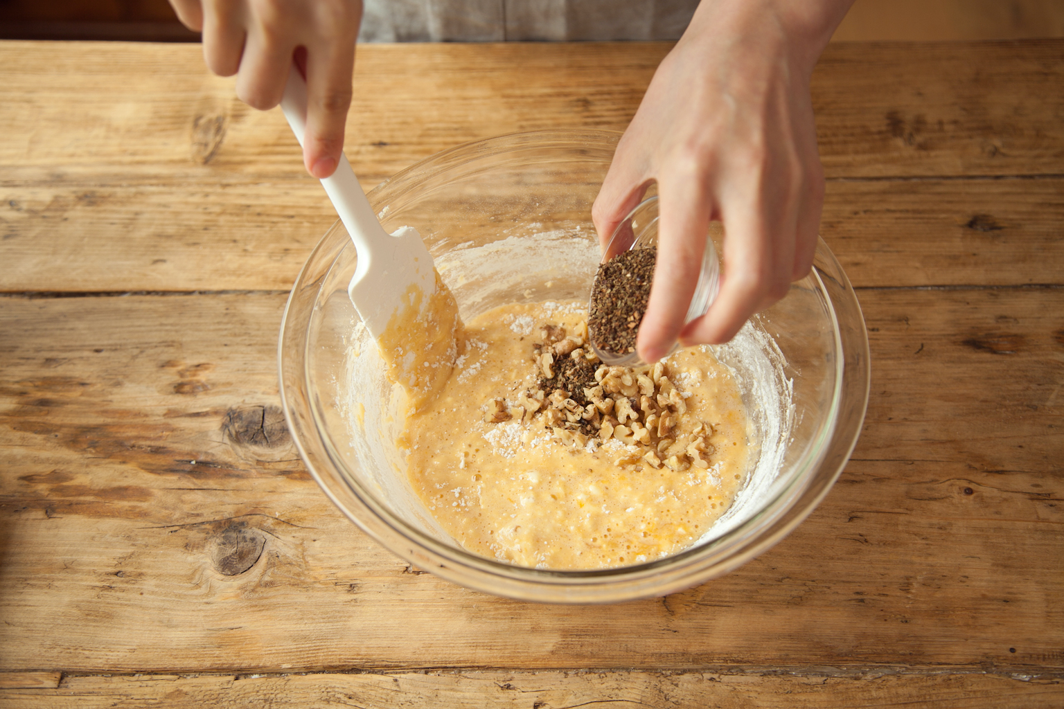 粉気がほぼなくなったら、茶葉、くるみを加え混ぜる。