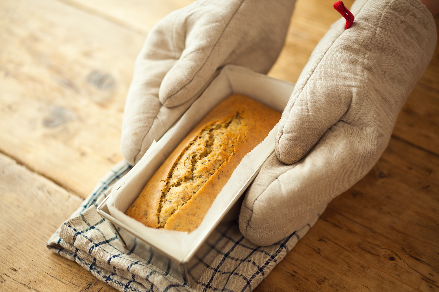 粉っぽさがなくなったら型に流し入れ、オーブンで25〜35分ほど焼く。