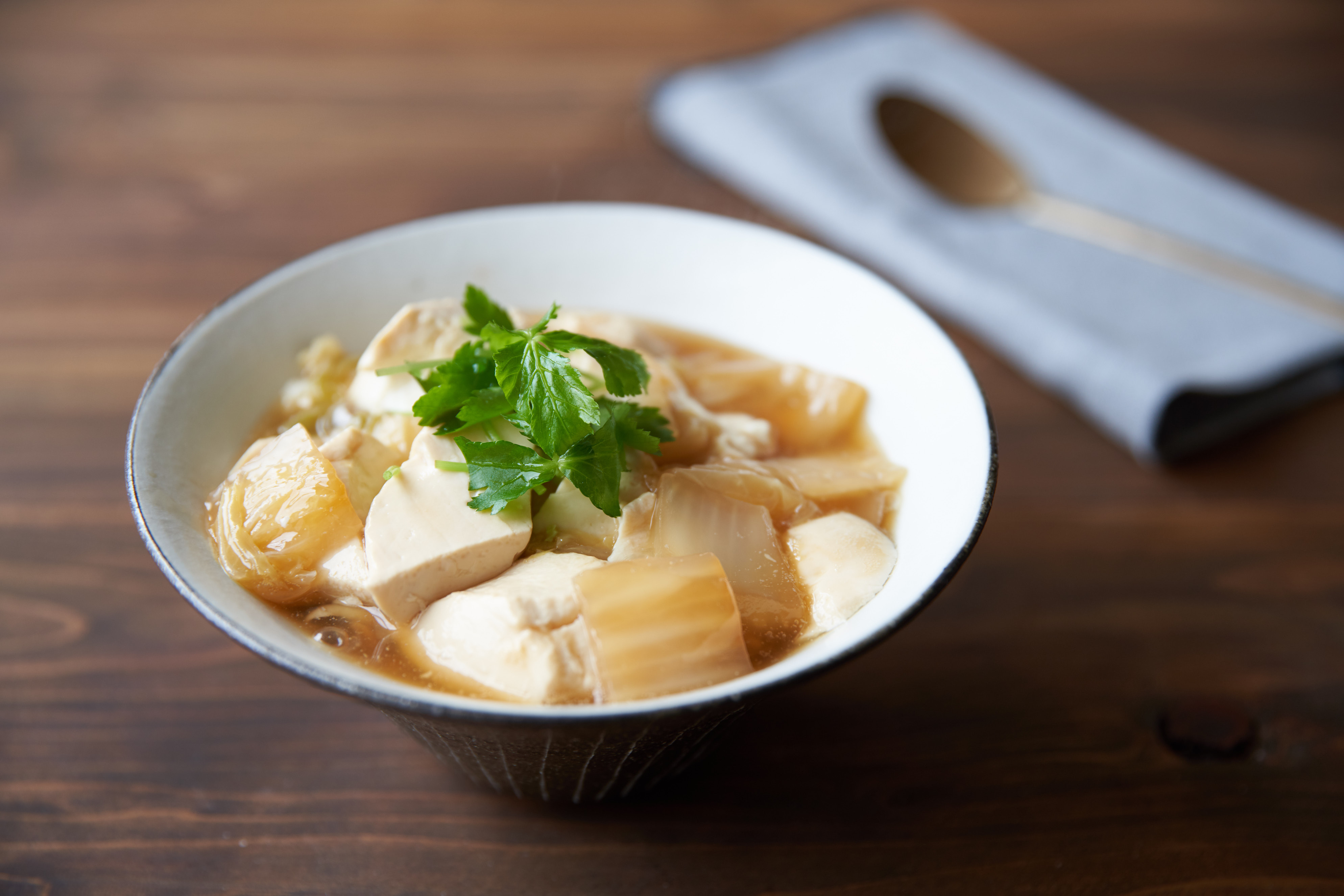 くたくたになるまでじっくり煮込んだ白菜と豆腐のアツアツのあんかけを