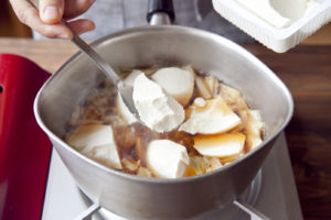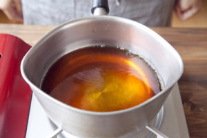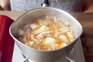 鍋にだし汁、しょうゆ、みりんを入れて強火にかける。