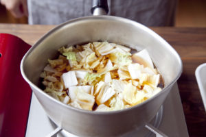 沸騰したら中火にして、白菜を茎、葉の順に入れて蓋をし、10 分煮る。