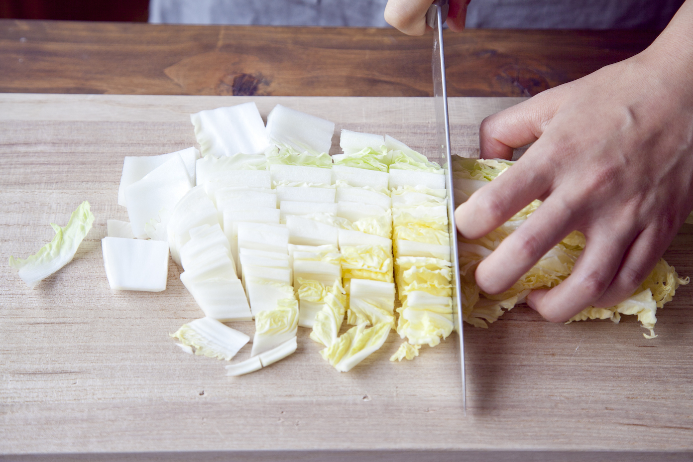白菜は一口大に切る。三つ葉は3cm程度の長さに切る。