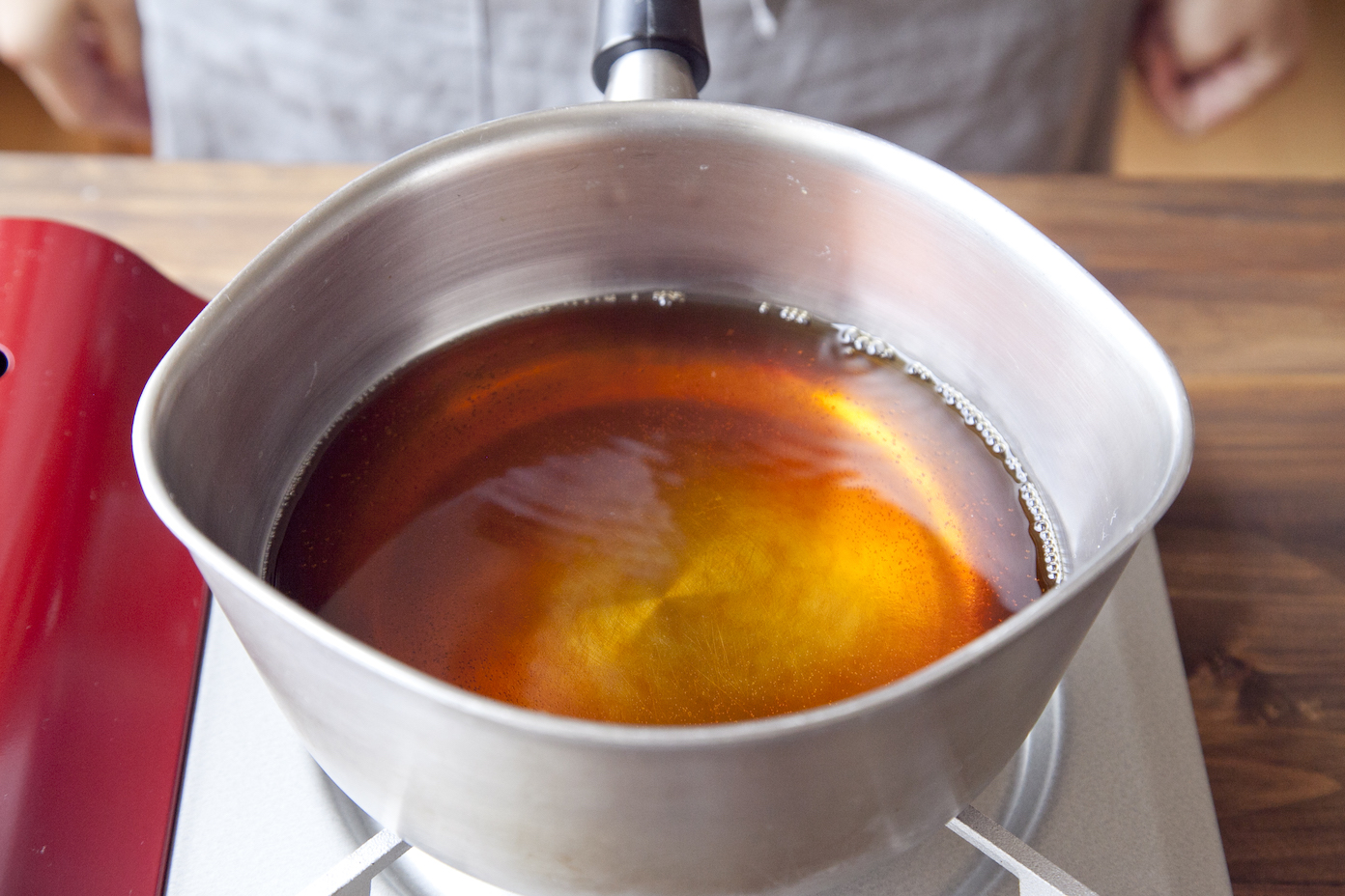 鍋にだし汁、しょうゆ、みりんを入れて強火にかける。