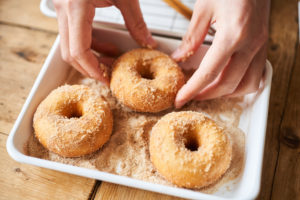 やけどに気をつけて熱いうちにきび砂糖、シナモンパウダーをつける。