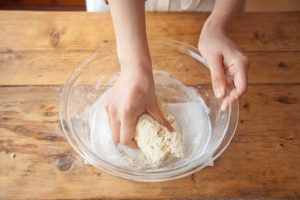 ボウルに白玉粉を入れて粉状になるまで手ですりつぶす。