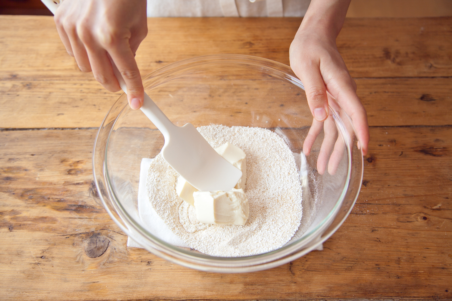 ボウルに白玉粉を入れて粉状になるまで手ですりつぶす。
