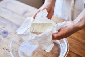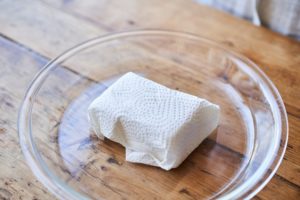 豆腐はペーパータオルで二重に包んで耐熱皿に入れ、
