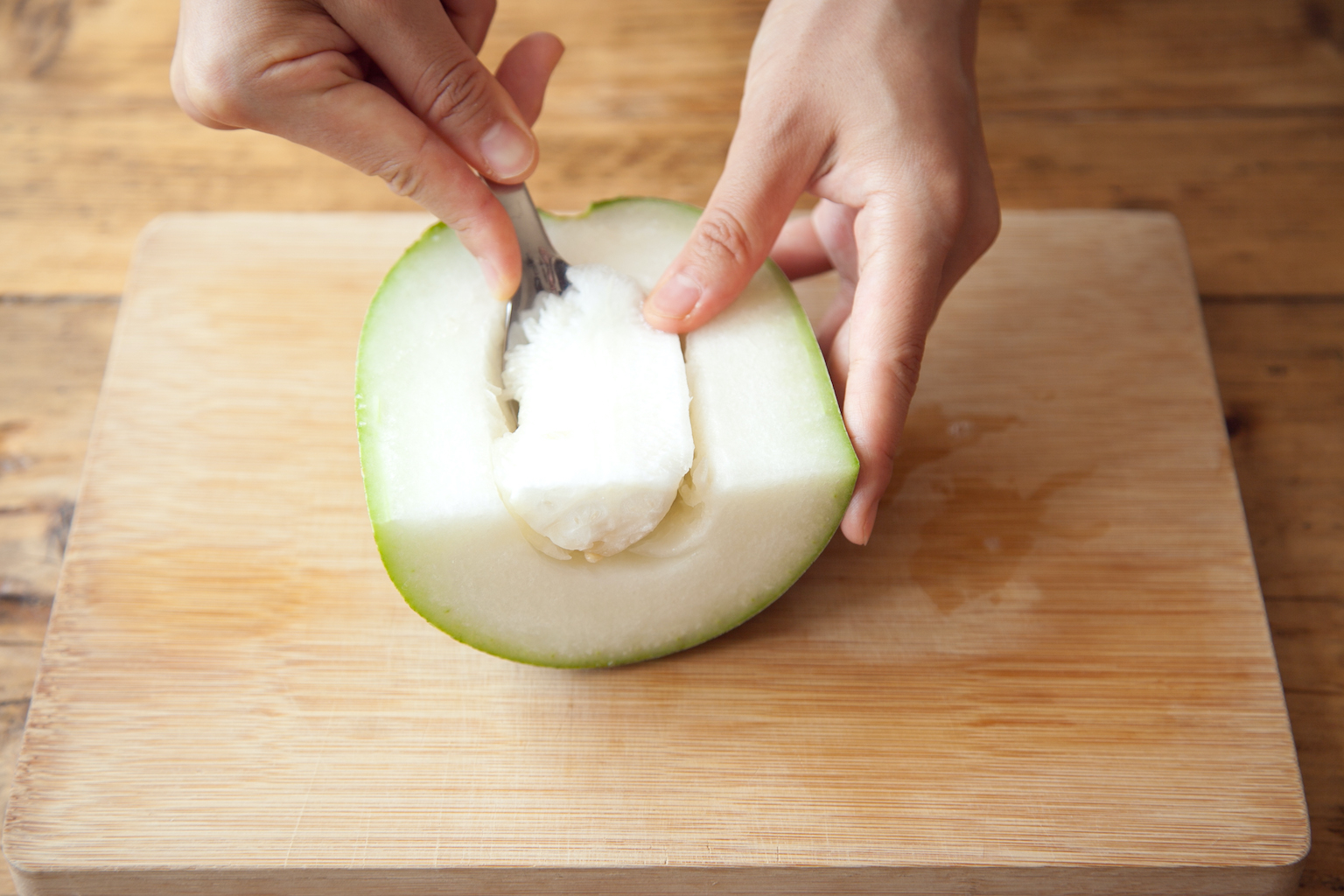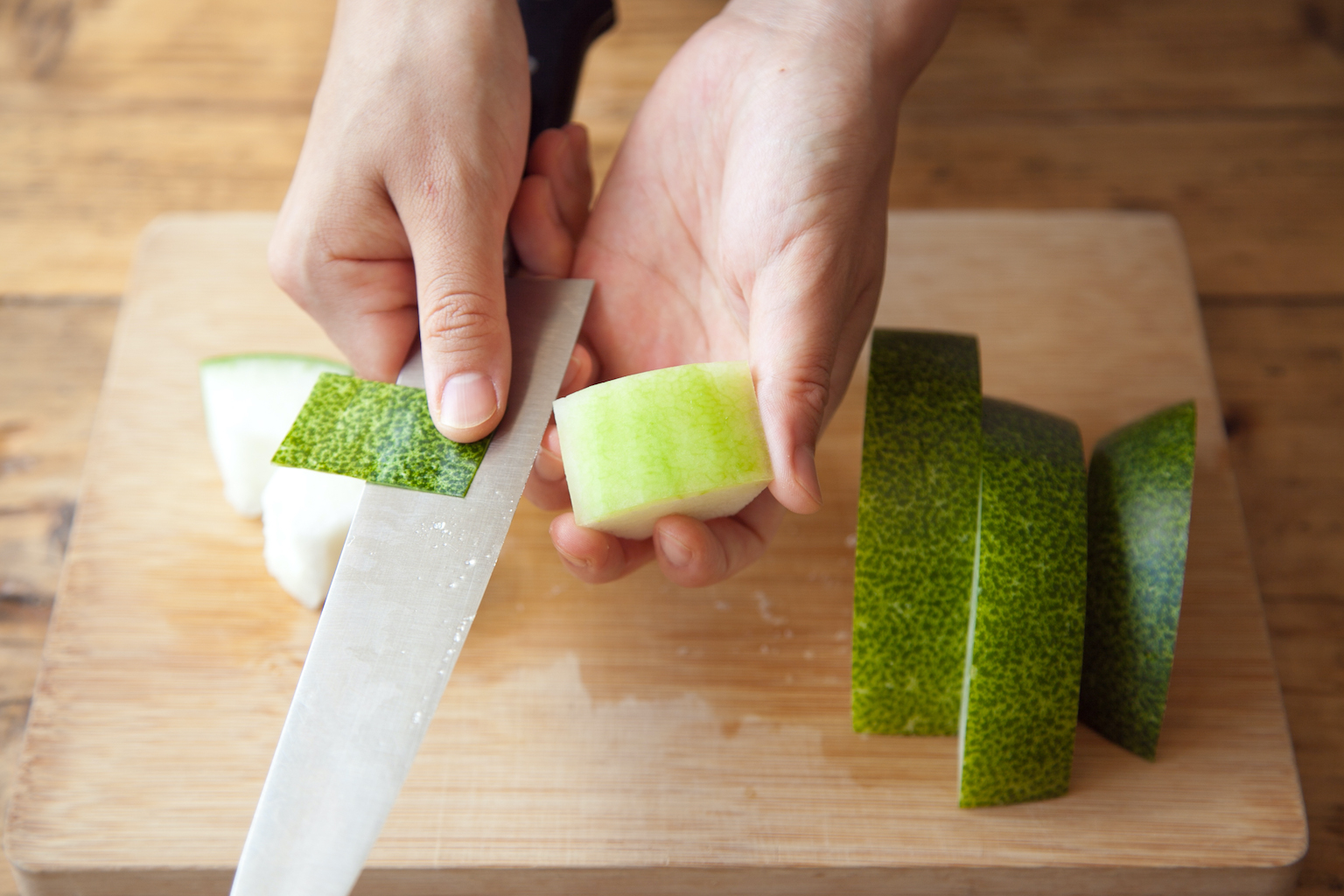 冬瓜はたねとわたを取り除き、3〜4cm 角に切り、皮を剥く。