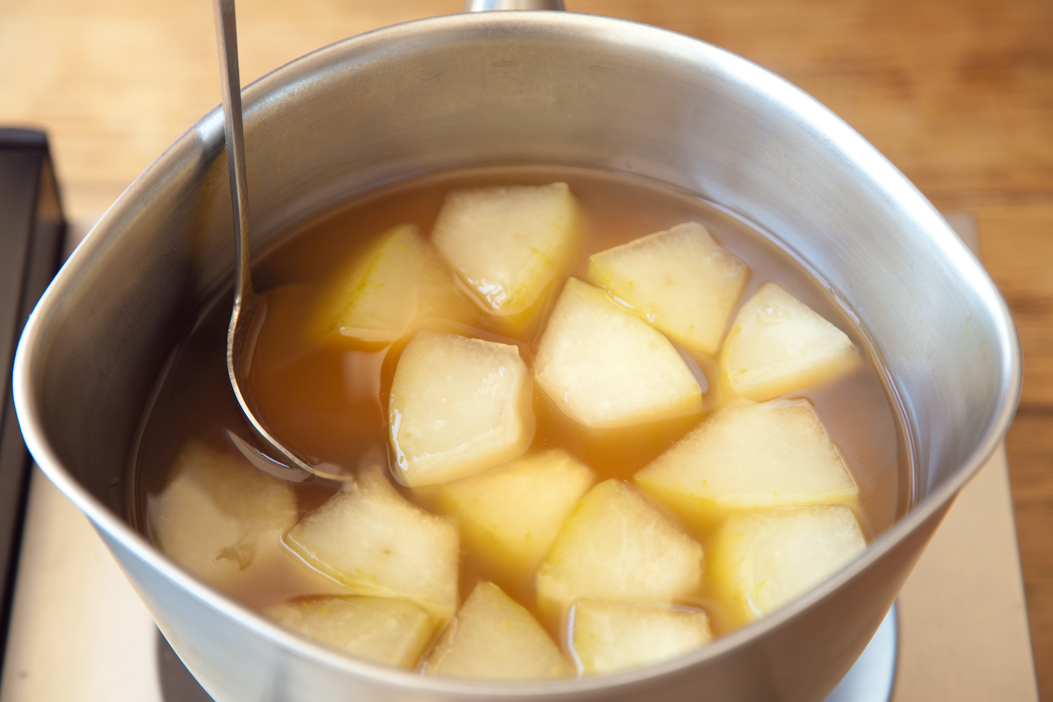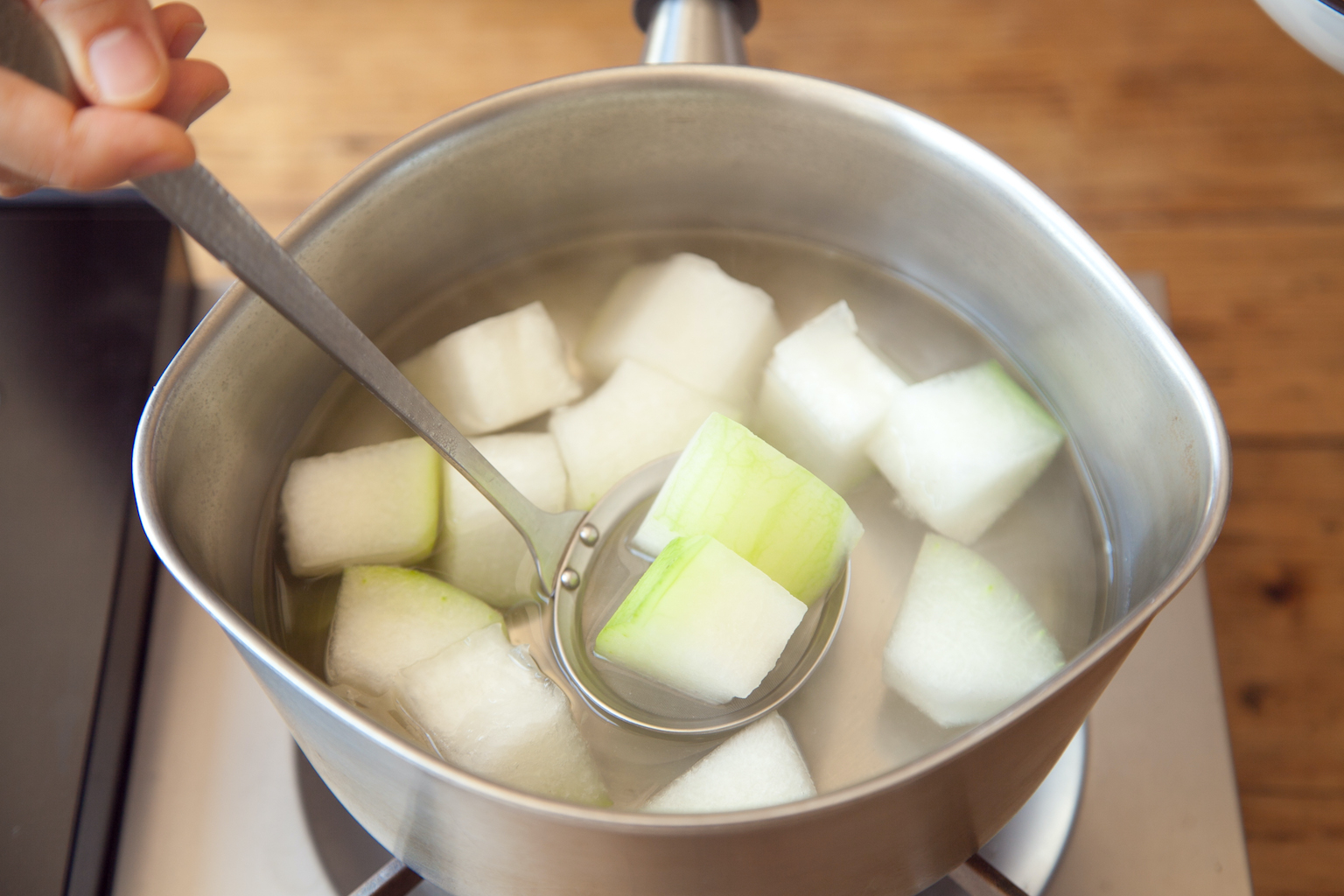 煮たったら10 分ほど、冬瓜に竹串がすっと入る程度まで茹でて、