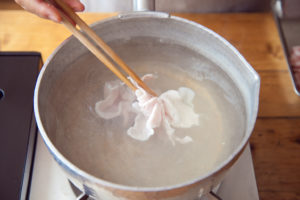 塩(小さじ1程度/分量外)をいれて豚肉を3〜4枚ずつ入れ、