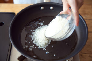 フライパンにオリーブオイルを熱し、米を洗わずに加え、中火で炒める。