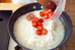 米が透き通ってきたら白ワインを加えさっと炒める。