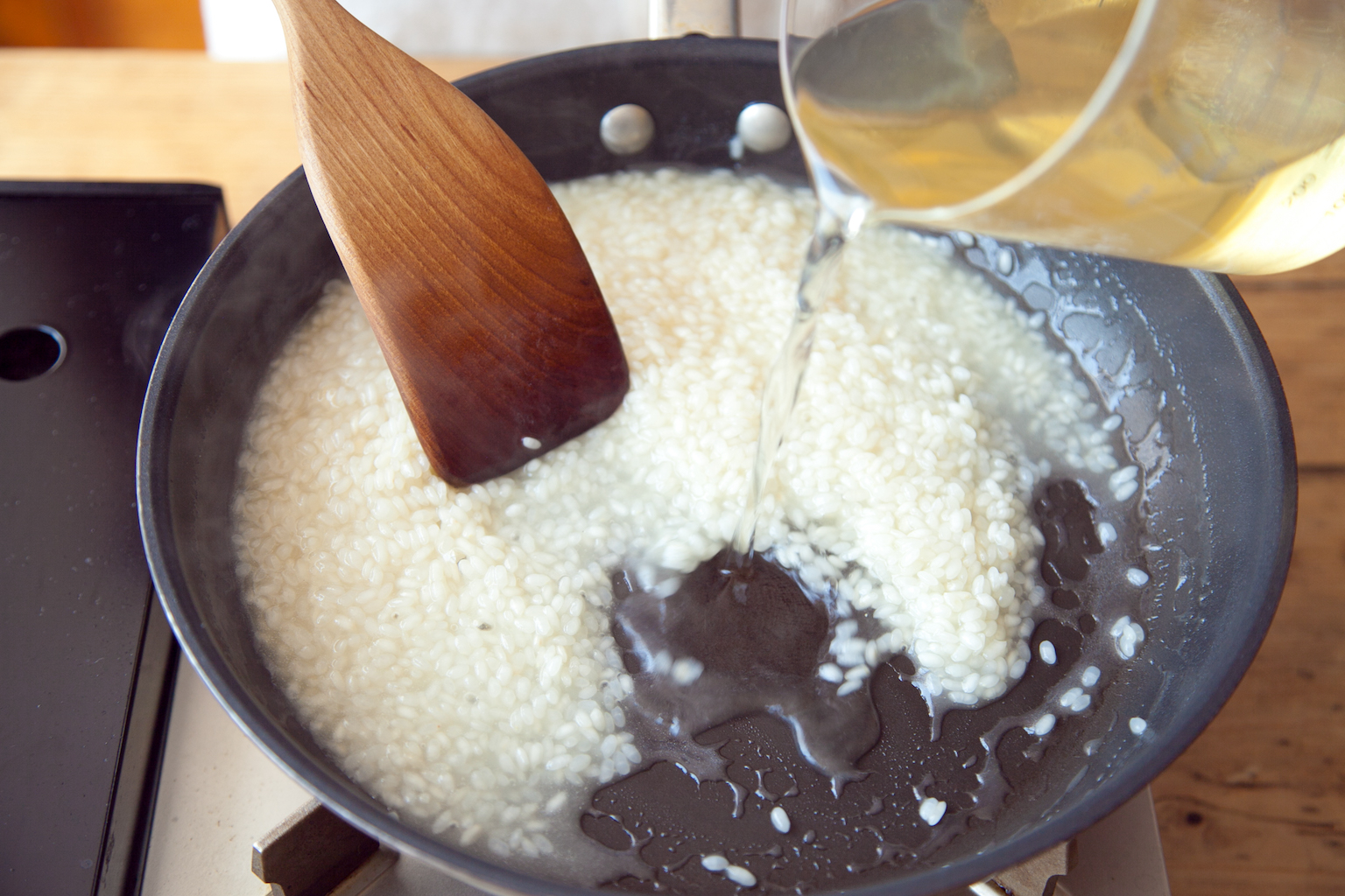 米が透き通ってきたら白ワインを加えさっと炒める。